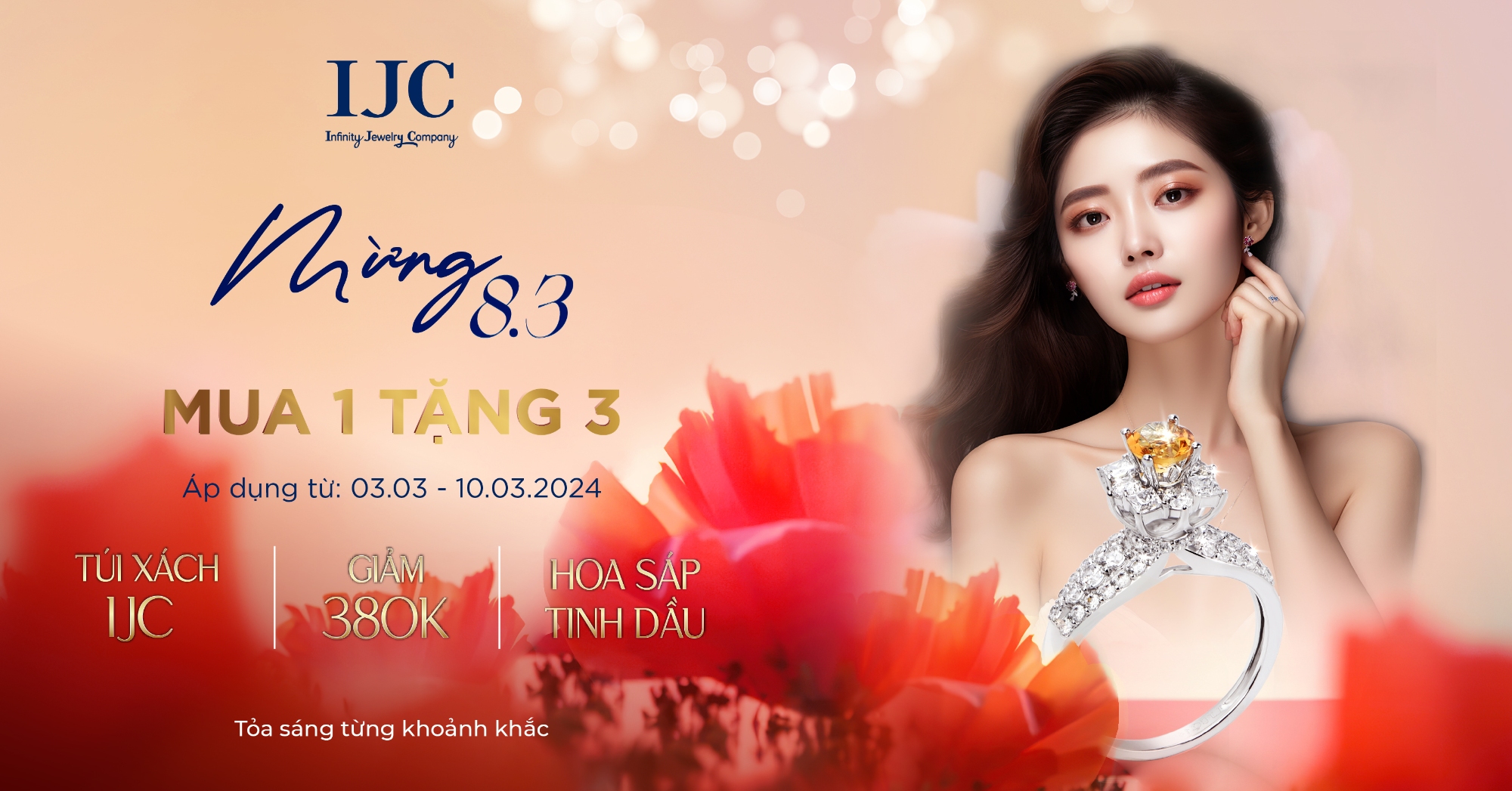 Chương trình bắt đầu từ ngày 03/03 – 10/03/2024; chỉ áp dụng cho trang sức thiết kế IJC và không áp dụng đồng thời các chương trình khuyến mãi khác.