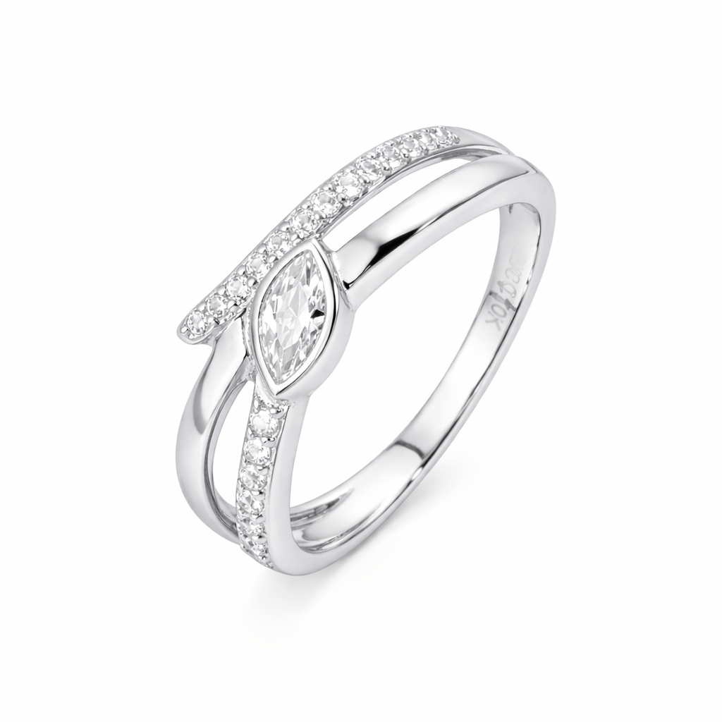 Sở hữu thiết kế thanh mảnh nhưng không hề đơn điệu, chiếc nhẫn vàng 10K đính đá CZ này ghi điểm với chi tiết đính đá hình marquise nổi bật ở trung tâm. Hai dải vàng mềm mại đan xen, tạo hiệu ứng chuyển động đầy uyển chuyển, như dòng chảy tinh tế trên bàn tay người đeo.